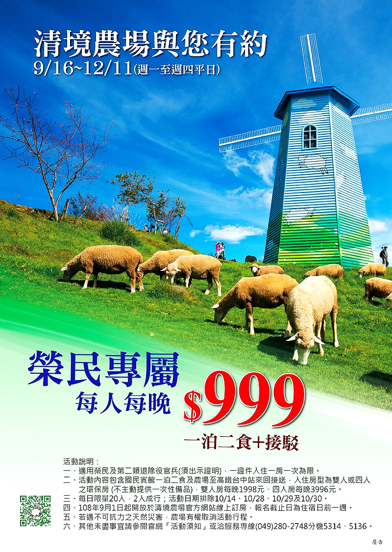 方案二:每人999元優惠(2人行成),凡榮民及第二類退除役官兵於108年9月16日至12月11日之平日(星期一至四),每天出一團20人,一泊二食、 清境-台中高鐵來回接駁、國民賓館-青青草原接駁、 青青草原門票、小瑞士花園門票及參加禮一份,採網路線上報名,依完成報名訂房順序額滿為止。