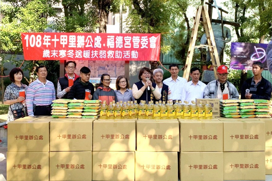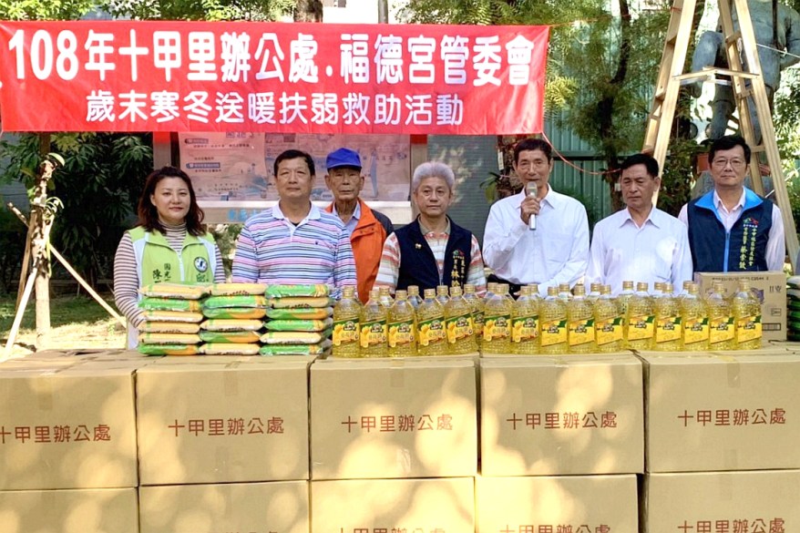 [記者張銀澤/台中報導] 108年台中市東區十甲里辦公處、福德宮管理委員會,12月21日福德宮廣場舉辦十甲里寒冬送暖、關懷弱勢活動,值此歲末寒冬之際,特提供實用物資平安米與日常生活用品一批,藉此拋磚引玉,帶動各界共襄盛舉,將愛送入里民鄉親,溫暖每位長者的心。