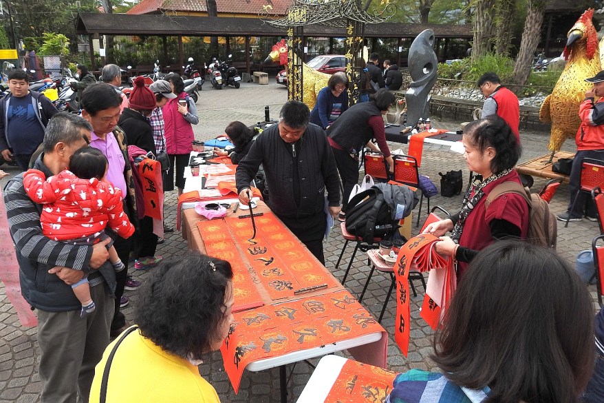 莊主委並說,台中書藝學會的書法家們到紫南宮現場揮毫,寫春聯贈送給民眾,春聯佳句吉語特別有內涵,不僅為紫南宮添文風,更為信眾增喜氣,而且書法家們還發心幫助弱勢,所以擺上樂捐箱,民眾隨喜樂捐的所得,書藝學會全都捐做公益,也相當難得。