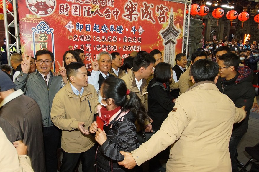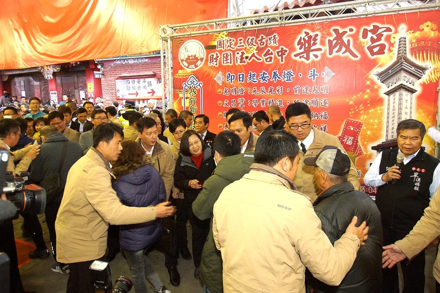蔡英文抵達台中樂成宮,在樂成宮董事長郭松益、交通部部長林佳龍、內政部長徐國勇、立委黃國書、何欣純、莊競程立委、常務董事何敏誠議員和諸位市議員及樂成宮董監事等人陪同下,向眾神尊誠心上香參拜祈福,祈求國家風調雨順,民富國強,隨後在廟埕開始發送小紅包,董事長郭松益和何敏誠議員也向前來領取小紅包的民眾表達新春祝福,看到熟識的鄉親,更熱情打招呼,現場氣氛相當熱鬧。