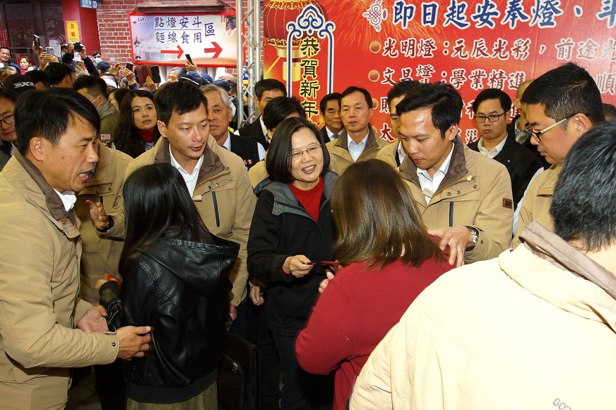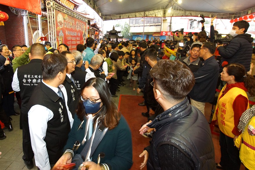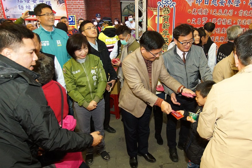 蔡英文總統車隊下午4點30分來到台中樂成宮發紅包,民眾大聲喊出「總統好」,場面有夠high,民眾為了向總統蔡英文討個吉利,大排長龍綿延數條巷弄馬路,等總統發紅包,從蔡英文和交通部部長林佳龍手中拿到蔡英文滿滿的祝福和林佳龍「行道晉安」紅包,象徵福氣滿滿,平安好運一整年。