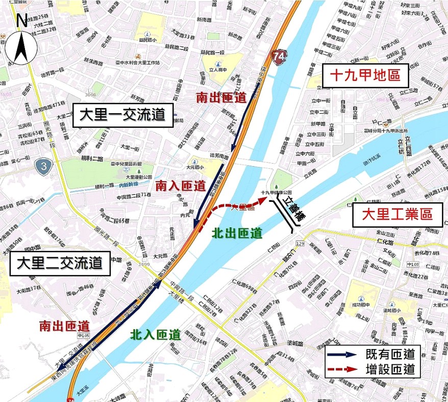 [新媒社記者黃嘉雯/台中報導] 地方引頸期盼的台74線增設大里十九甲北出匝道計畫,可行性評估報告昨(5)日獲中央核定。市府交通局長葉昭甫表示,這是市長盧秀燕重要施政計畫,感謝中央支持,後續市府將協助用地取得,由中央設計及施工,盼儘速完工通車,未來尖峰時段車輛繞行平面道路約可減少6分鐘,也讓大台中交通路網更完善。