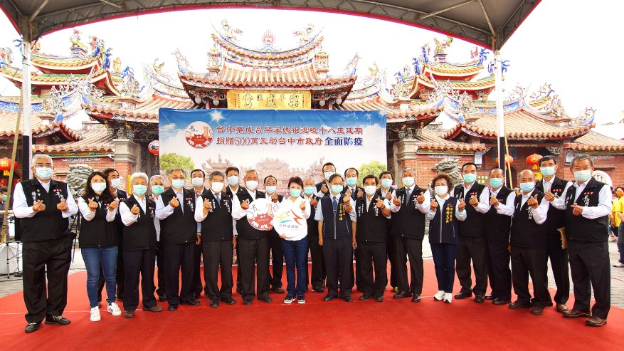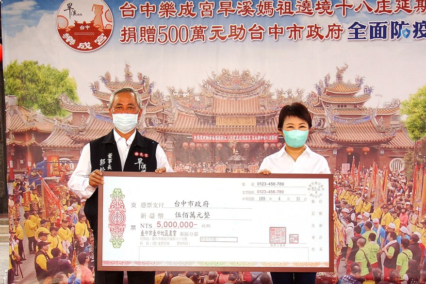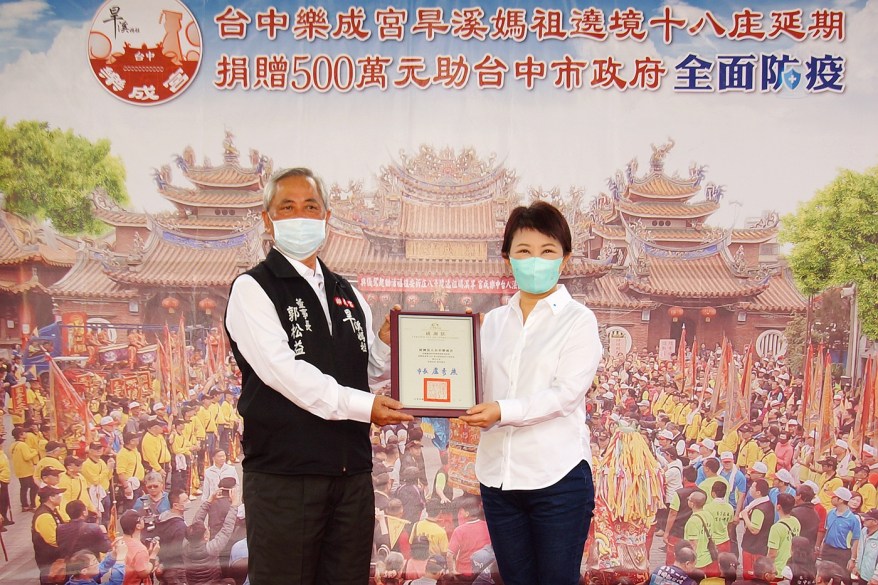 因應新冠肺炎疫情,台中市樂成宮今年「旱溪媽祖遶境十八庄」活動延期舉辦,樂成宮相挺在地,將原訂支應遶境的500萬元經費,捐給台中市政府作為防疫基金,今(11)日舉行捐贈儀式,由市長盧秀燕代表受贈,並頒發感謝狀給廟方,此筆經費將用於添購平板電腦480台及額溫槍80支,充實教育防疫設施。