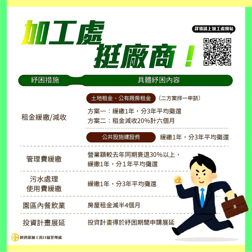 加工處進一步說明,加工區紓困優惠內容包括土地、建物租金減收20%計6個月或緩繳1年;營業額衰退30%以上者,管理費緩繳1年;投資計畫展延;污水費緩繳1年;區內餐飲業房租減半收取4個月等五大措施,希望協助減輕廠商營運負擔,以挺過這波災情。