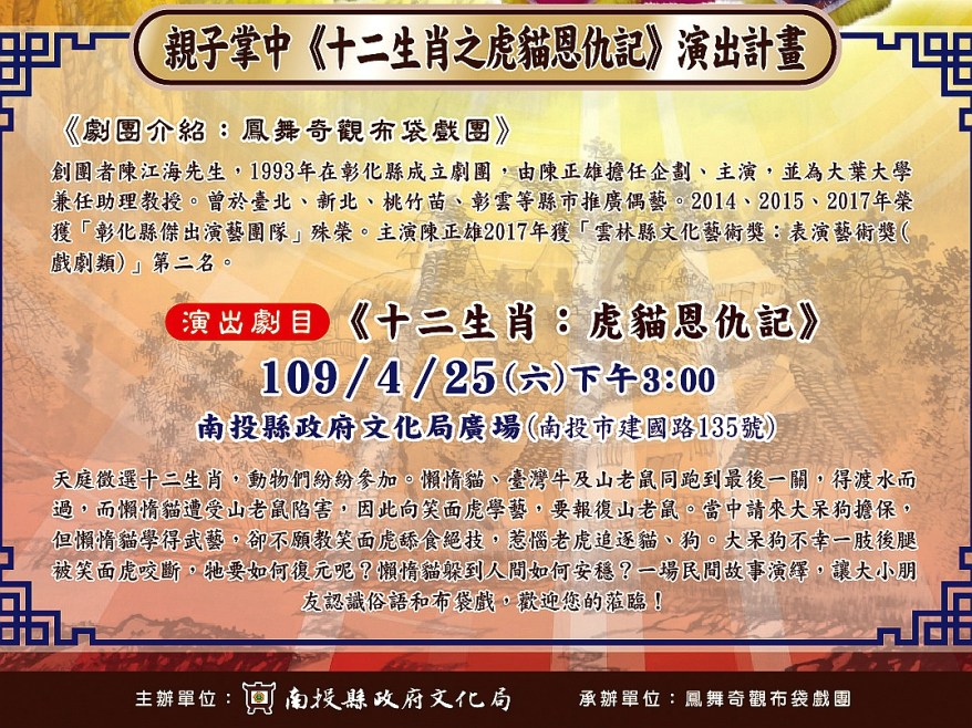 本次演出劇目《十二生肖之虎貓恩仇記》,為劇團創編劇作,取自十二生肖、虎貓互換武藝之民間故事,加以融合編演,劇情趣味、富教育意涵,適合大、小朋友觀賞。劇情敘述十二生肖由來,為天庭舉辦賽跑徵選十二生肖,山老鼠僥倖得第一,欺騙懶惰貓,因而引發貓與鼠的衝突。其中演繹詮釋以往的「死貓吊樹頭、死狗放水流」風俗由來。本場次由陳正雄領銜演出,是南投首場,歡迎大家蒞臨欣賞!