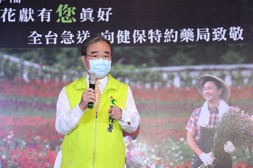[新媒社 記者張銀澤/南投報導] 為感謝防疫期間6千多家健保特約藥局及衛生所辛苦協助販售口罩,行政院農業委員會農糧署與台灣花店協會特別合作辦理「用花傳幸福 花獻有您真好」贈送花禮活動,於本(109)年4月22日在臺北花市由農糧署胡忠一署長及國產花卉形象影片代言人謝祖武先生一起致贈藥師公會代表葉人誠常務理事花禮,感謝他們的辛勞,並邀請全國民眾一同向守在疫情最前線的工作人員獻出花禮,用花傳幸福。