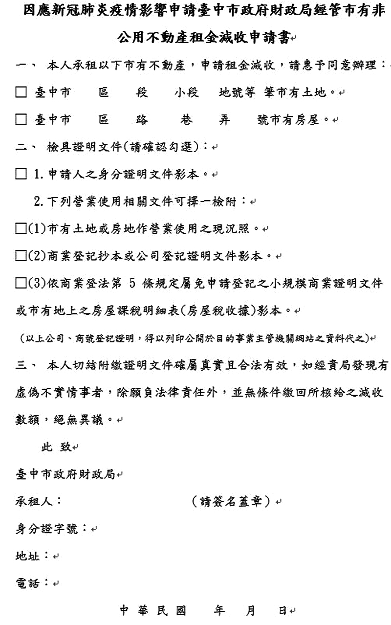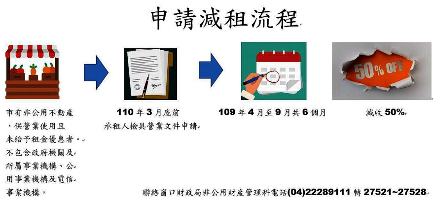 [新媒社 記者黃嘉雯/台中報導] 為降低新冠肺炎疫情對經濟的衝擊,台中市政府財政局即日起至9月30日止,針對承租市有非公用不動產且供營業使用者,減收租金50%,市府已發文通知承租戶,已享有租金優惠者除外,盼助業者紓困。