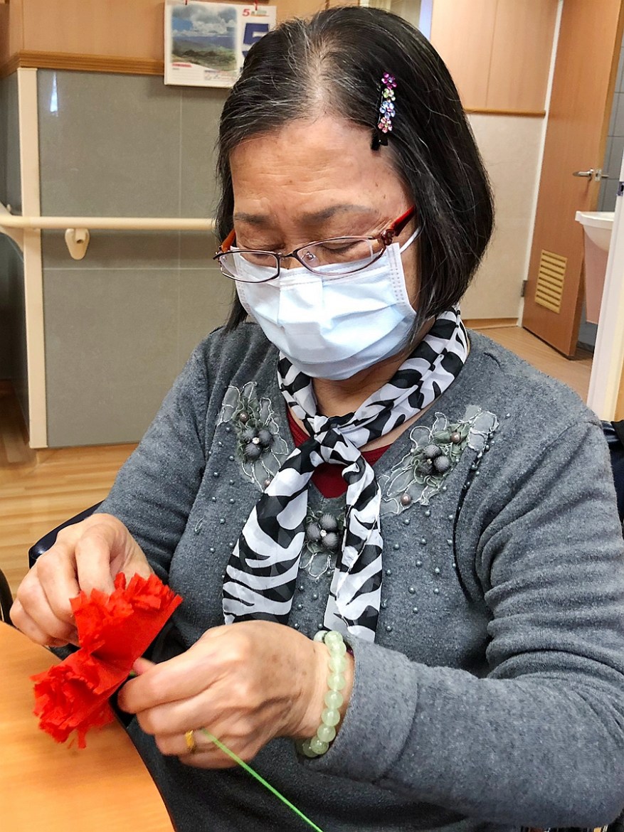 規劃活動的個案管理師林翊嘉表示,希望提前過母親節,把機構長輩手作康乃馨蘊含的滿滿關愛,帶到社區的長輩家,在感恩的節日裡,讓低調又默默付出的媽媽都能感受母親節的溫馨。