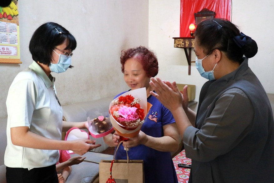 新媒社 記者張銀澤/台中報導] 愛不因(COVID-19)疫情而有距離!臺中慈濟護理之家負責人莊淑婷6日率慈濟長推中心及臺中慈濟護理之家同仁關懷潭子區長照個案家,提前為三個家庭過母親節「有愛大聲說~驚喜到你家~」