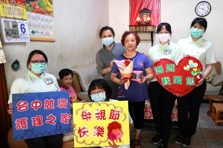 臺中慈濟護理之家負責人莊淑婷與同仁,帶著機構長輩手做康乃馨,前往三位長照個案家庭,祝福辛苦的媽媽。莊淑婷表示:長照中心照顧的低收入戶家庭,房子很多都是租的,經濟確實有困難,其中有位腦性麻痺四十一年的孩子,已經讓媽媽辛苦照顧四十一年,但媽媽無怨無悔。