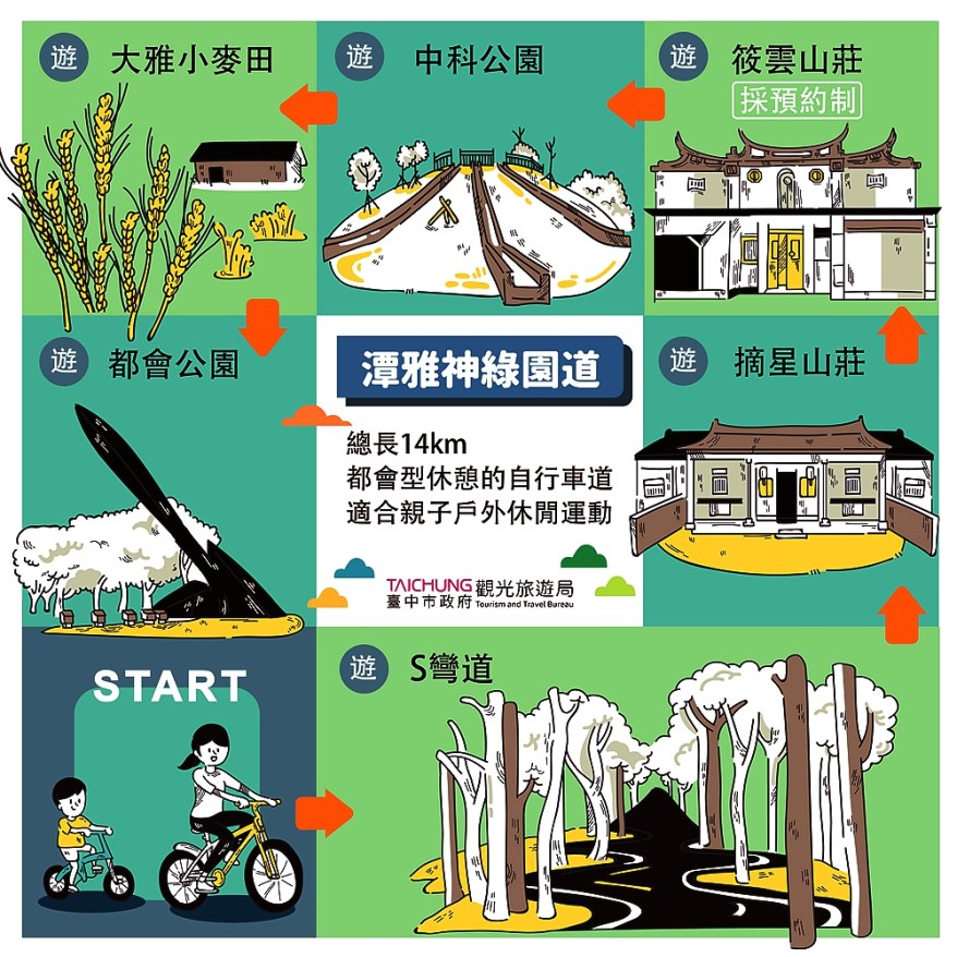 [新媒社 記者張庭瑋/台中報導] 母親節帶媽媽去哪出遊!台中市政府觀光旅遊局特別規劃「潭雅神鐵馬樂活之旅」行程,潭雅神綠園道啟用迄今已逾16個年頭,為聞名全台的台中市經典自行車道之一,利用軍方舊鐵道神岡支線興建而成,從潭子區中山路起,經神岡區,終點在大雅區中科公園,全長約14公里且路面坡度平緩,可根據個人的興趣與體力來調整行程,無論是大朋友、小朋友、或是鐵馬達人,都能玩得盡興又愉快。騎乘自行車的運動強度老少咸宜,更能燃燒熱量甩油健身、提升免疫力,歡迎大小朋友連假期間到台中暢騎。