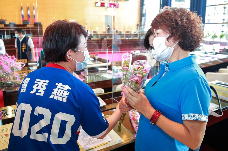 市議員包括冉齡軒、朱暖英、李麗華、吳瓊華、張瀞分、陳成添、議會工作人員及在場媒體記者皆收到盧市長贈送的康乃馨花束,彼此互道母親節快樂。