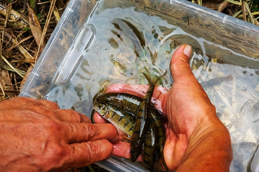 班長伸手進溪水中,拿起前一晚擺放的捕捉籠,只見好多魚蝦在裡面亂跳。倒入小盒中,班長一一解說著各種魚類的特徵和名字,還帶著小朋友認識大自然的奧妙,體驗生命在手心脈動的感覺。