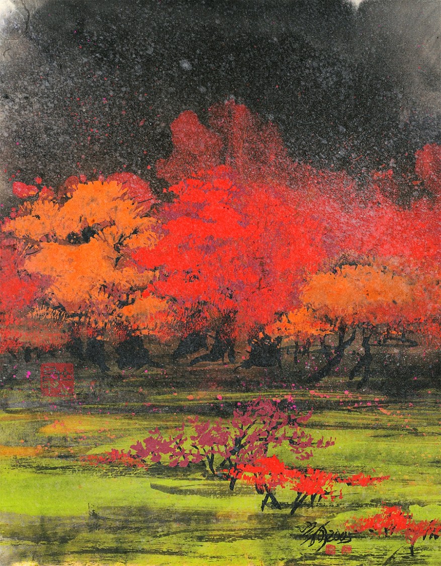 不論是寫實或寫意,皆形成揮灑自如、由靜而動的個人獨特氣質與風格;畫中多變的山形,壯闊的田野與綿延的山河,莫不大氣磅礡,借由厚重與疊塊技法,延伸出不同的組構,敷以四時的色彩,時而灑脫時而深沈,筆墨酣暢,反襯出清淡悠遠的畫境,讓水墨看似單純卻蘊含文學意味,為後輩樹立兼具傳統但不畏創新的典範。