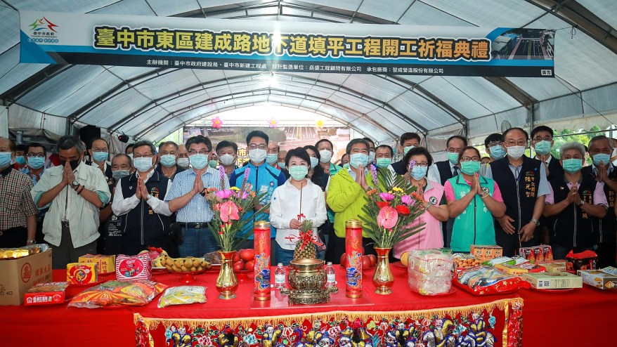 今日建成路地下道填平工程開工典禮,包括盧市長、建設局長陳大田、民政局長吳世瑋、教育局長楊振昇、內政部營建署中區工程處長何志浩、東區區長陳佩玉、市議員何敏誠、李中、邱素貞、羅廷瑋、地方多位里長及市政顧問,以及立法委員黃國書、何欣純、市議員鄭功進服務處代表等人均到場祈求工程順利完工。
