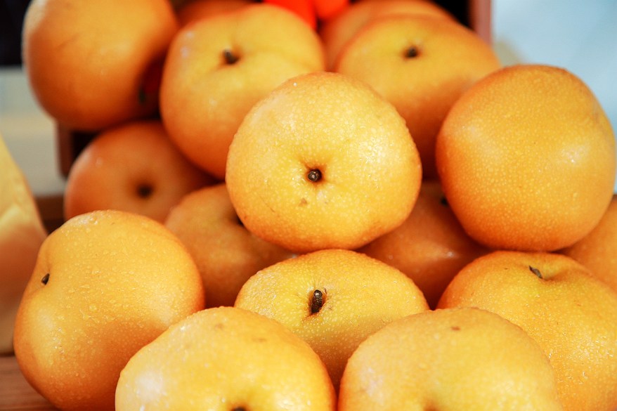 時常在中部產區出現,大顆呈橢圓形的水梨則很有可能是豐水梨、新興梨或幸水梨。一般人不易分辦這三種常見的水梨,但都非常好吃,再加上高接梨技術發達,從6至9月都有梨子可享用。