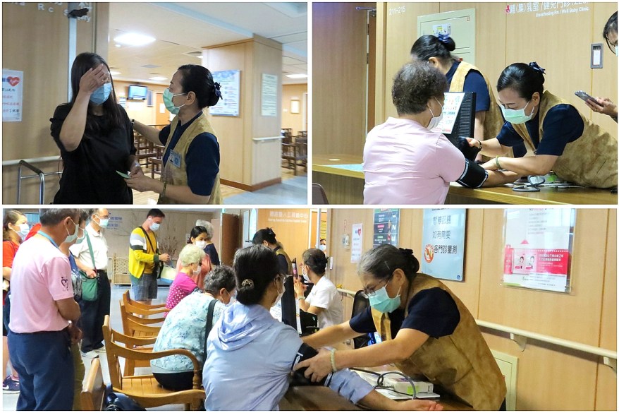 血壓站是病人看診的第一站,護理同仁楊月枝一見志工來,立刻擁抱:「你們回來真的很好,還好你們回來了!我們非常需要你們,真的!」志工彭蘭嬌開心回應「我們也很想你們啊!」本身行動不便的志工張雪蘭是醫療志工常客,恢復的第一批就來參與,不忘防疫,先擦拭所有設備,讓病人能夠放心測量。路過的看診病人特別來打招呼,感恩說:「少了你們的服務好不習慣,而且也不知道自助設備如何用、還有指引動線,有你們真好!」簡單一句感恩,讓張雪蘭甜在心裡,露出口罩外的笑眼。