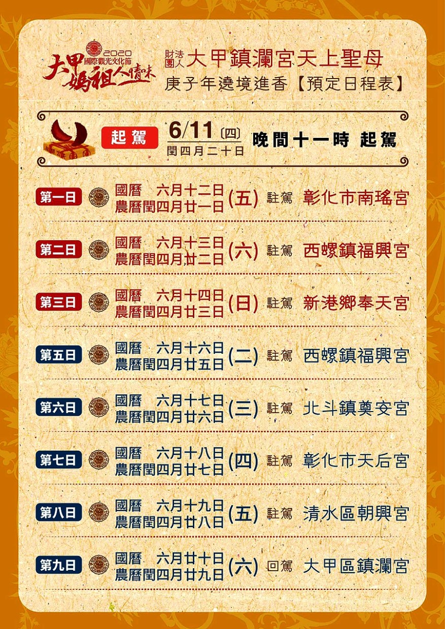2020大甲鎮瀾宮媽祖遶境 – 國曆6月11起駕 6月20日回鑾 !