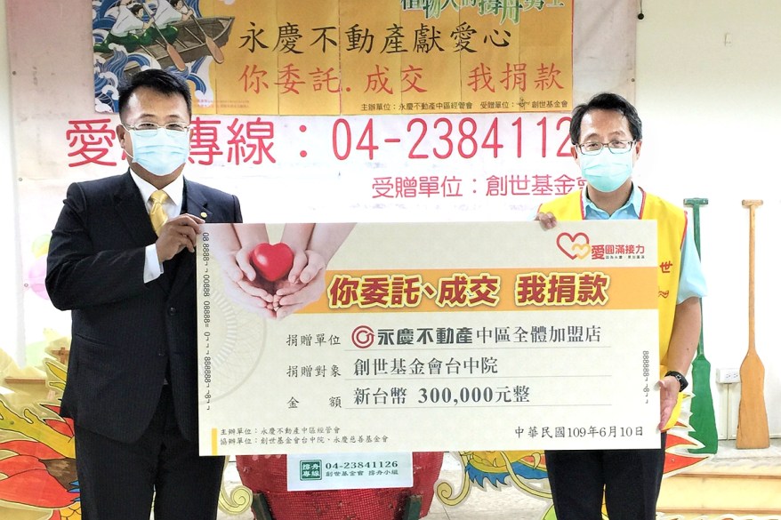[新媒社 記者張銀澤/台中報導] 「永慶獻愛心,你委託(專任)/成交-我捐款」活動,在永慶不動產中區經管會號召下,獲得95家加盟店熱情響應做公益,在短短時間內募集到30萬善款,今(10日)在陳立信會長帶領下,將這一份愛心送至創世台中安養院。也期望今年底前能朝向目標200萬邁進,支持植物人整年度安養服務,在疫情逆流當下,當植物人的撐舟勇士,齊力撐舟助創世。