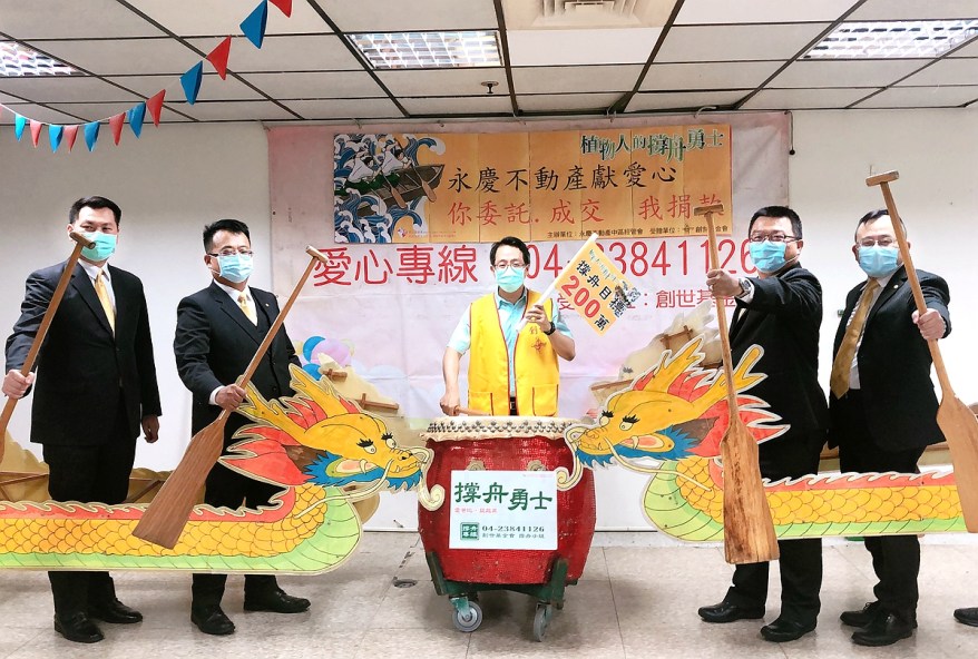 永慶不動產中區經管會陳立信會長表示,創世照顧植物人會面臨大量人力及物力需求,今年因疫情影響,社會捐款大幅下滑,為鼓勵民眾投身公益,永慶不動產推出「永慶獻愛心,你委託(專任)/成交-我捐款」活動,活動由南向北接力進行。適逢端午節前,陳會長帶領主管及員工,化身為龍舟的槳手、鼓手和奪標手,齊聲吶喊向前划,最後將「撐舟目標200萬」的標旗拿下,期許今年支持植物人年度安養,200萬的總目標能順利達陣。創世台中院陳韋龍院長則將「撐舟勇士,感謝一路有您」的感謝狀致贈給永慶房屋陳立信會長。