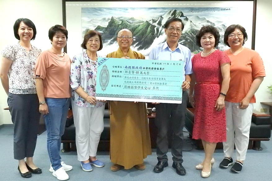 [新媒社 記者張銀澤/南投報導] 為幫助南投縣弱勢學生,佛光山清德寺、同德家商、瑞盈鐵工廠有限公司、愛心家族勸募會,17日合力捐贈愛心善款40 萬元給南投縣政府,提供縣內家境清寒的學生整體的關懷與照顧。