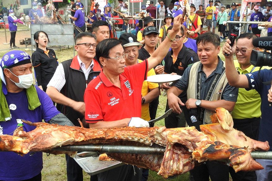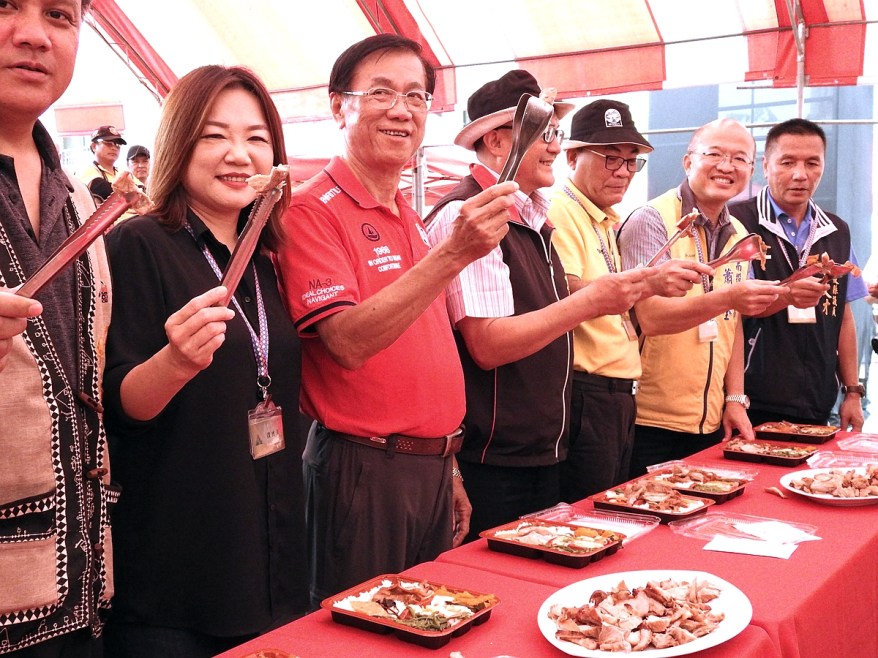 林縣長帶領貴賓及遊客登橋巡禮領略全台最深最長最多彩的雙龍七彩吊橋絕美勝景後,接著並參加部落觀光嘉年華,並為烤大豬認證研習評審切下第一刀,當面肯定南投縣原民烤大豬技藝傳承超群,更特別的是,林縣長和貴賓們特別以現烤大豬為主菜,手作「向抗疫醫護致敬」便當,贈送給與會南投醫院、埔里基督教醫院及竹山秀傳的醫護代表。