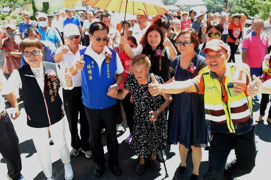 在地106歲的人瑞阿嬤廖王蔭由82歲的兒子廖本懿陪同,在縣長林明溱挽手扶持下,帶領大批搶著體驗新橋的民眾,率先緩步走過嶄新的龍興大橋,雖然豔陽高照烈日當空,人瑞阿嬤雖然忍不住喊著好熱,還是步履穩健的走完龍興大橋,和林縣長共同見證,這座新橋終於落成通車的圓滿。