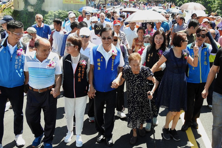 在地106歲的人瑞阿嬤廖王蔭由82歲的兒子廖本懿陪同,在縣長林明溱挽手扶持下,帶領大批搶著體驗新橋的民眾,率先緩步走過嶄新的龍興大橋,雖然豔陽高照烈日當空,人瑞阿嬤雖然忍不住喊著好熱,還是步履穩健的走完龍興大橋,和林縣長共同見證,這座新橋終於落成通車的圓滿。