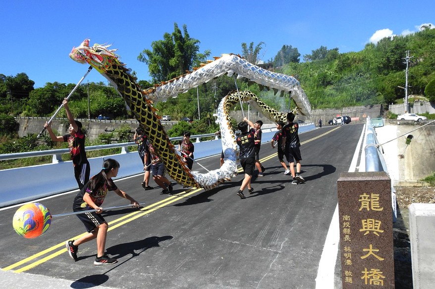 [新媒社 記者黃嘉雯/南投報導] 越樟平溪連接南投市軍功、內興里的龍興大橋,前年底動工改建新橋,21日新橋落成,徹底解除舊橋危險疑慮,更大幅提升通行安全與流量,地方歡慶通車,縣長林明溱攜手106歲人瑞廖王蔭,在營北國中祥龍隊前導下,率先引領地方民眾走過新開通的龍興大橋,場面喜氣洋洋熱鬧滾滾。