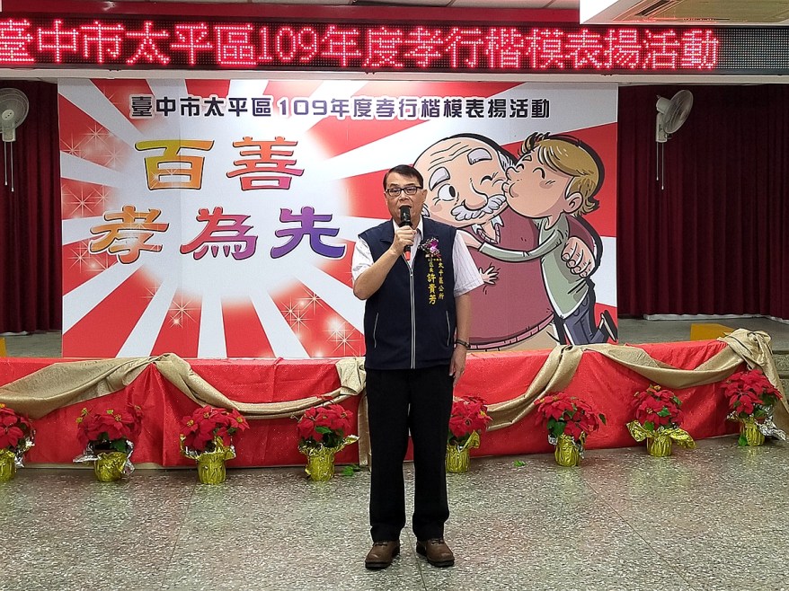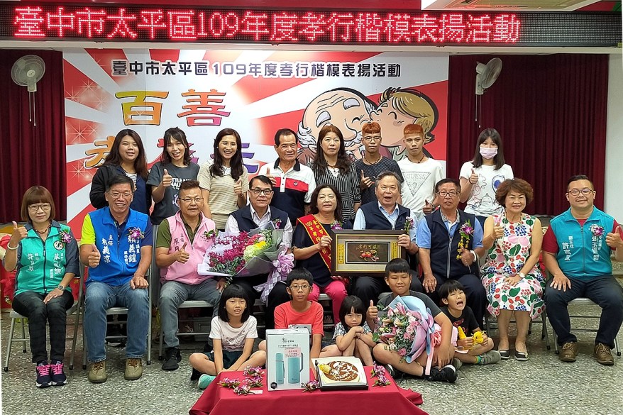 [新媒社 記者張銀澤/台中報導] 2020太平區公所於今(23)日下午3時,假本所3樓大禮堂辦理本年度孝行楷模表揚活動;農業局長蔡精強代表盧秀燕市長致贈18位孝行楷模匾額、禮物、蛋糕、鮮花及滿滿的祝福。