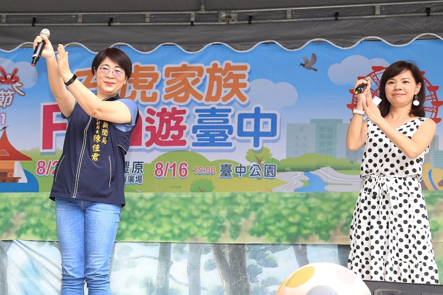 新聞局副局長陳佳君化身「佳君姐姐」,提醒小朋友們在後疫情時代要勤洗手、戴口罩,希望大家跟石虎家族及YOYO家族一起度過快樂的時光;陳副局長表示,此次活動還有交通安全闖關遊戲,讓小朋友們學到許多安全知識,此外,正值台中購物節期間,她也邀請現場民眾參加購物節,有機會抽中百萬現金、豪宅。