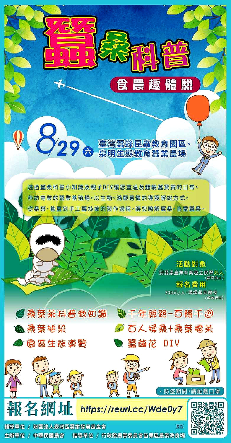 五、活動對象:對蠶桑產業有興趣之民眾,限35人報名,額滿截止報名,報名費用200元/每人,活動當日(8/29)現場報到時繳交(僅收現金)。
