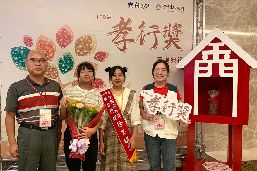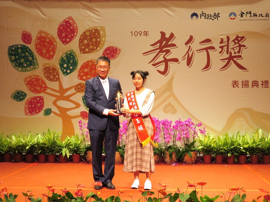 [新媒社 記者黃嘉雯/南投報導] 國姓鄉徐玉娟同學雖年幼時家逢巨變,但樂觀進取,事親至孝,與姐弟共同照顧90幾歲的祖母,及因整理家務傷到背部的母親,後因其弟因養鹿工作絞斷手指造成永久傷害後,獨力承擔家中大小事務,孝行可風,經縣府訪查遴選,代表本縣提報內政部審查表揚,日前前往金門出席內政部辦理109年全國孝行獎表揚活動接受表揚,徐同學的孝行堪為社會及家庭之表率。