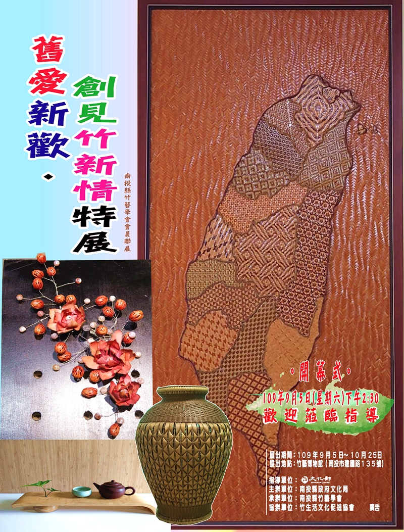 本特展由南投縣竹藝學會多位會員包括林建成、王秀禎、吳秀鳳、張彩淑…等,提供早期及近期的精緻作品,有簡約之美、或作工繁複的竹編,皆是創意與美感齊備的藝術創作。謹訂於109年9月5日星期六下午3:00於竹藝博物館辦理開幕式,敬邀各界蒞臨指導。