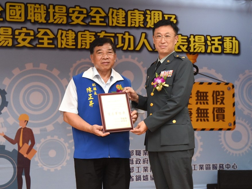 會中由陳副縣長依序頒發獎狀表揚推行職場安全健康有功人員外,並頒發職業安全衛生輔導員聘書,也代頒發給榮獲勞動部全國推行職業安全健康優良單位獎牌給陸軍兵工整備發展中心,由該中心主任巫道安代表接受,肯定該單位的優異表現。而包括縣議員賴燕雪、工業會理事長施明芳等人也到場位基層勞工加油打氣。