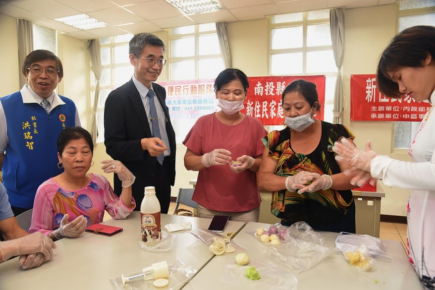 [新媒社 記者黃嘉雯/南投報導] 2020南投縣府秘書長洪瑞智23日陪同內政部移民署副署長梁國輝、海峽交流基金會法律處科長陳穎慶前往縣立婦幼館出席移民署與南投縣新住民家庭服務中心共同舉辦之「中秋一起做月餅-多元文化暨越式冰皮月餅DIY」活動,稍早也到草屯鎮訪視大陸籍新住民江素梅女士,以實際行動瞭解新住民在臺就業適應情形,並視察行動服務據點及多元文化宣導成效,洪秘書長期許透過更多關懷輔導,打造更友善的環境,協助新住民能儘快融入在台生活;梁副署長則希望透過「行動關懷列車」滿載著移民署的關懷與祝福,散播至新住民的心中。