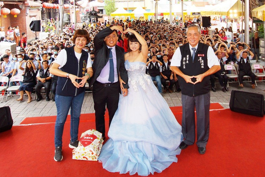 董事長郭松益說、今年回來分享的一對新人是去年108年參加活動認識的何俊逸、游文君兩人在今年6月登記結婚、今天回來分享心得和現場所有參加者共沾喜氣、樂成宮董事長郭松益特別致贈黃金「金鏟子」,盼新人早生貴子「先生貴子,後生女郎;福貴雙全,永遠吉祥!」帶著福氣為宜居台中市新增人口數而努力。