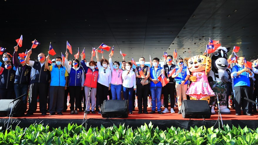 [新媒社 記者張銀澤/台中報導] 2020台中市政府(10)日在府前廣場舉辦國慶升旗典禮,現場突破2萬人潮,旗海飄揚,氣氛High爆,捷運綠線市政府站今日也首度開箱,上午就擠爆數千參觀人潮。市長盧秀燕表示,今年雖受疫情影響,但市府團隊化危機為轉機,台中購物節突破90億元、招商引資1800億元全台最佳,全力振興經濟,另外空污治理也逐步展現成果,今天藍天白雲就是最好證明。