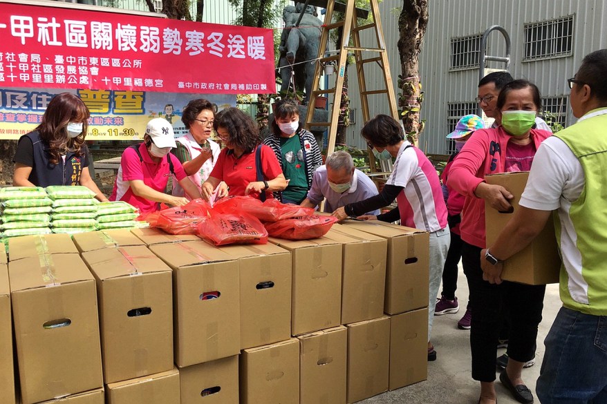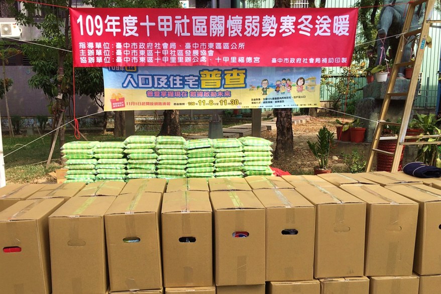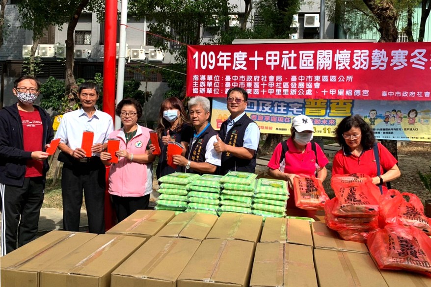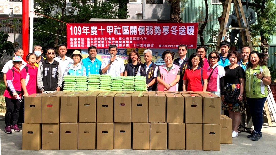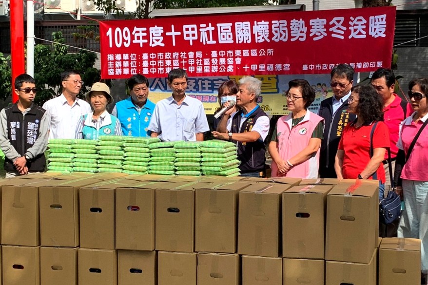台中市東區十甲里長林昑照表示台灣社會已邁入老年化,獨居老人及弱勢家庭亟需社會關懷,因此109年十甲里寒冬送暖、關懷弱勢,讓溫暖散播與人間,照顧關懷里民,感謝十甲里福德宮,林里長說十甲里有44戶低收入,每位低收入戶贊助慰問金$2000元及一大箱物資及白米。希望充分發揮愛里民服務精神,深入各社區,十甲里長林昑照主動服務轄區弱勢家庭,讓他們可以感受節日的熱鬧及社會的溫暖。
