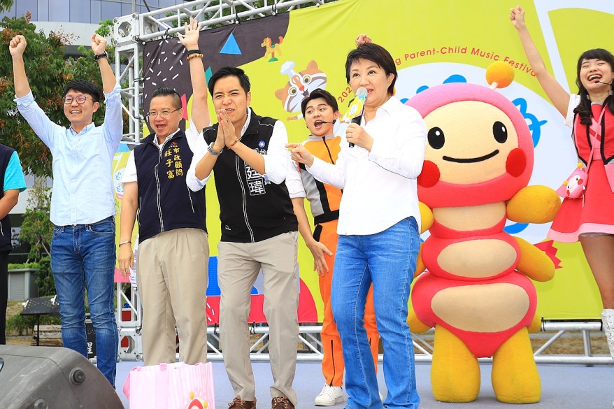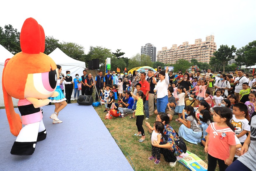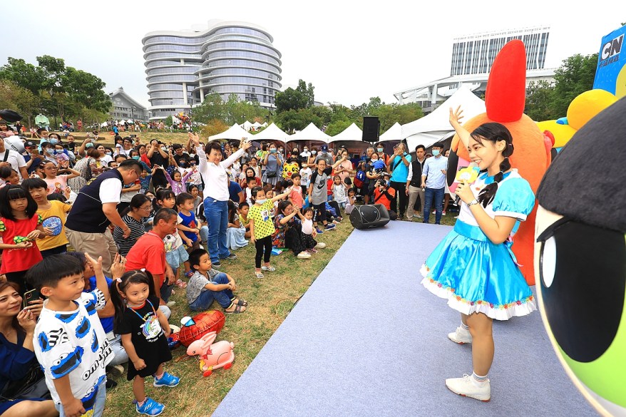 由市府新聞局舉辦的親子音樂季首日登場,吸引許多爸媽帶著小朋友參加,跟著舞台上的卡通明星帶動唱,體驗親子闖關遊戲,笑聲不斷,盧市長也席地而坐,與家長愉快聊天、和孩子們玩耍,氣氛輕鬆歡樂。