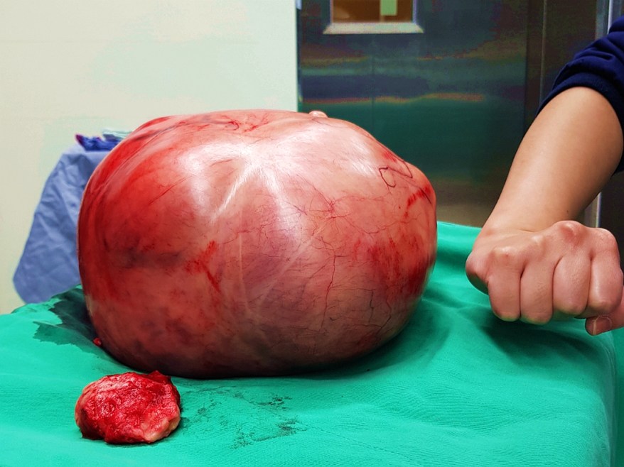 [新媒社 記者張銀澤/台中報導] 56歲黃姓婦人,日前因上腹痛、不舒服至腸胃科就醫,檢查有異轉至婦產科做進一步檢查,經腹部超音波及電腦斷層,發現子宮上長了一顆直徑27公分,重達7.9公斤的子宮肌瘤,比雙胞胎還大,幸在婦產科團隊魏沛秝醫師及吳佩玲醫師合力進行子宮全切除手術,經過二小時才順利將這顆巨瘤取出,送驗病理報告是良性子宮肌瘤。呼籲女性,每年配合子宮頸抹片檢查,搭配做陰道超音波檢查,才能早期發現早期治療。
