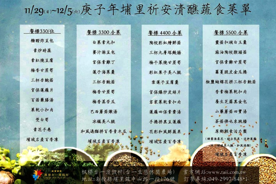 [新媒社 記者張銀澤/南投報導] 「明天記得吃素喔!」配合南投縣埔里鎮「祈安清醮」百年傳統,自11月29日至12月5日全鎮茹素7天。台一生態休閒農場(楓樺台一渡假村)餐廳特別推出適合個人獨享的「建醮套餐」,「個人每套330元」。團體則有精選素食合菜,適用10位賓客,口味各具特色,邀您一起享受蔬食生活。