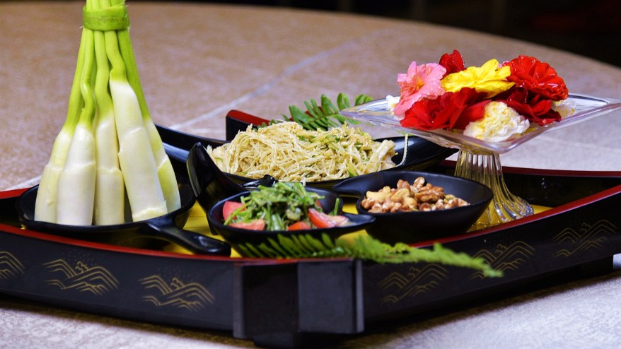 有別於一般個人套餐印象,「台一合菜5500元」「素套餐」共有11道佳餚,包括:「糖醋炸豆包」、「素炒時蔬」、「素紅燒豆腐」、「梅香甘蔗筍」、「三杯杏鮑菇」、「宮保蓮藕片」、「百菇藥膳湯」、「菜乾小扣肉」、「筊白筍」、「素花手卷」、「埔城百香凍」素食菜單有每桌3300元,4400元,5500元三款選擇。