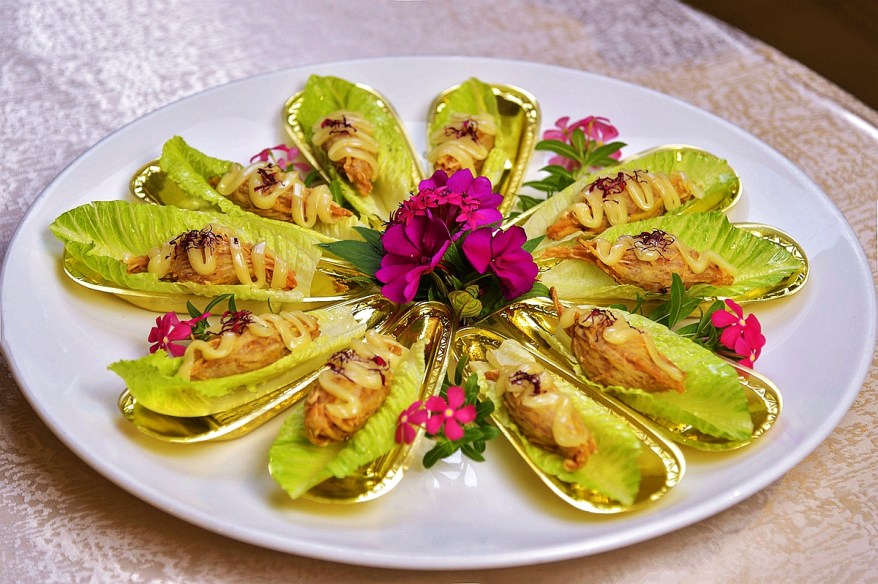另一道以農場栽培的花卉入菜的「素花手卷」,這道菜常常是每一位饕客必嚐的美食。香草或花卉透過料理手法與食材搭配,常會迸出獨特的味道,令人驚艷!如:金蓮花,它是天然的芥末醬,本身就有一股芥末的嗆辣味,做成日式的花手卷或醬料,很美味;海棠花的酸勁十足,但與蜂蜜搭配時,又顯得可口,酸甜皆宜啊!