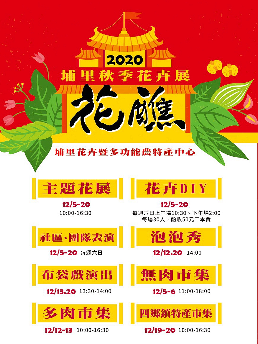 [新媒社 記者黃嘉雯/南投報導] 「2020埔里花卉秋季展」於109年12月5日起至12月20日在埔里多功能花卉及農特產品處理展售中心盛大展出,本活動由埔里鎮公所、社團法人中華盆花發展協會、行政院中部聯合服務中心、日月潭國家風景區管理處及行政院農業委員會農糧署籌辦,活動期間適逢埔里12年一次的祈安護國清醮活動,特以宗教文化為主題,採用埔里在地花卉打造特色花醮,相當有看頭令人驚艷。