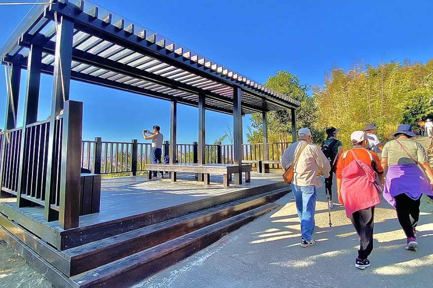 觀旅局長林筱淇表示,大坑9號步道風景秀麗平緩好走,屬於休閒級登山路線,即使平日也是遊客如織,觀景平台設置在可鳥瞰市景的9號步道,除了提供登山遊客休憩交流去處,亦可讓遊客駐足感受登山樂趣,觀景平台採直接基礎型式設置,較不易擾動邊坡土壤;同時為融入周邊自然景觀,建材採用天然木作硬木類材並於面層塗覆抗UV之護木塗漆提升平台整體耐久性、延長使用年限;屋頂為花架型式提升平台美學,屋頂上方也特別增設抗UV的PC面板,除有遮陽功能,亦提供遊客避雨使用;平台階梯與步道順平接合,讓遊客上、下階梯時方便不費力,另外也貼心設置4座休憩座椅,讓民眾在休息之餘也能拍下動人的美麗登山照。