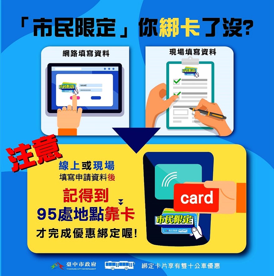 交通局表示,申請資料預填與綁卡地點資訊皆於「市民限定」網站 ,提醒民眾於網路填寫申請表後仍須至95處綁卡地點臨櫃靠卡,才算完成綁卡作業;若未及時於元旦前完成綁定,上車將被扣款15元,後續再依實際搭乘距離於下車時扣款,請市民特別留意。