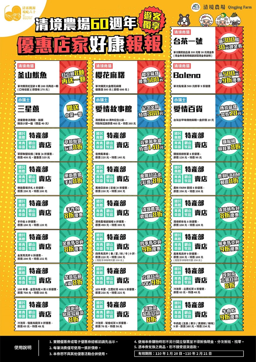 即日起自清境農場官網、FACEBOOK 下載或列印優惠券,於110年1月20日~110年2月21日至清境商場、小瑞士花園、國民賓館、青青草原、觀山牧區各賣店,結帳前先出示紙本優惠券或手機優惠券畫面,即可享受好康優惠折扣最低折扣8折,累計優惠金額約900元。