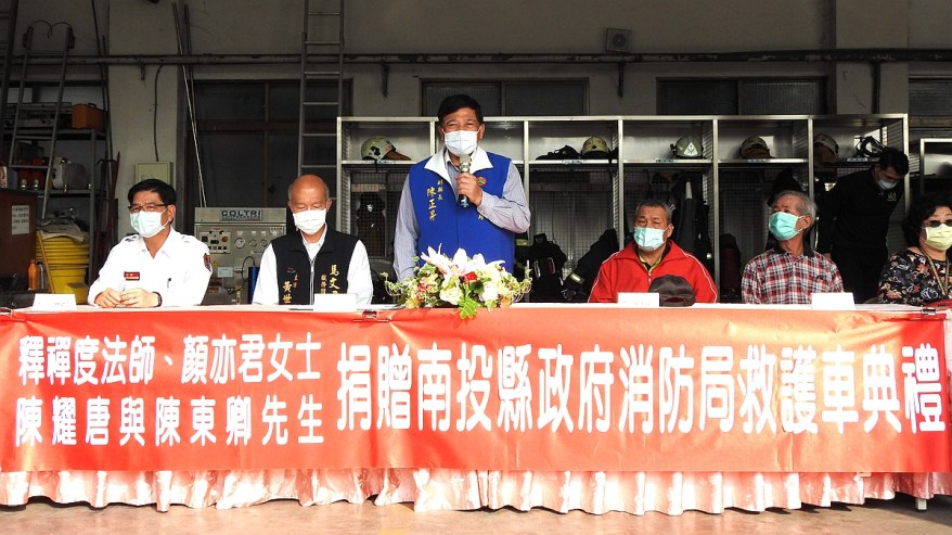 捐贈儀式5日在南投縣府消防局舉行,副縣長陳正昇、消防局長林聰吉及眾多消防救護隊員及義消在場見證,陳副縣長代表接受陳耀唐、陳東卿兄弟捐贈全新救護車,並回贈感謝狀及模型救護車、消防車紀念品,琉璃光菩提樹住持釋禪度及其弟子顏亦君女士因故不克到場,也由代表完成捐贈。
