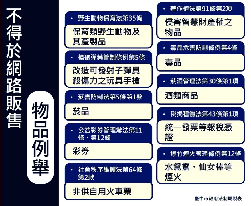 由於受到疫情的影響,相較於過去實體通路的購物型態,現下透過虛擬通路以網路購物的方式,明顯改變了民眾的消費習慣。李善植局長並再次提醒,除了上述藥事法規定無照不得販賣醫療器材藥品外,法制局特別列舉了其他像是保育類野生動物及其產製品、菸酒、煙火等10類物品,依據野生動物保育法等相關規定,因無法辨識消費者年齡、或為違禁品等,亦不得透過網路方式銷售。因此,民眾如要在網路上銷售商品,應確實瞭解相關規定或向主管機關查詢,避免誤觸法規受罰,讓荷包失血。